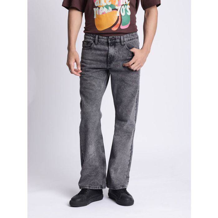 Dark shade, no fade black jeans Bootcut, mid-rise Clean look Non stretchable 5 pocket Length: regular | Size & Fit: Fit: Bootcut Non Stretchable The model (height 6') is wearing a size 32 | Material & Care: Cotton Machine Wash | Specifications: Distress: Clean Look | Waist Rise: Mid-Rise | Fade: No Fade | Shade: Dark | Fit: Bootcut | Length: Regular | Waistband: With belt loops | Stretch: Non Stretchable