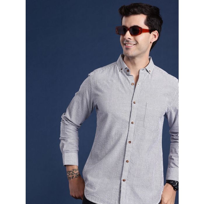 Blue and white striped casual shirt, has a button-down collar, long sleeves, curved hem, one patch pocket | Size & Fit: Slim fit The model (height 6') is wearing a size 40 | Material & Care: 100% cotton Machine-wash | Specifications: Sleeve Length: Long Sleeves | Collar: Button-Down Collar | Fit: Slim Fit | Length: Regular | Hemline: Curved | Placket: Button Placket | Placket Length: Full | Number of Pockets: 1
